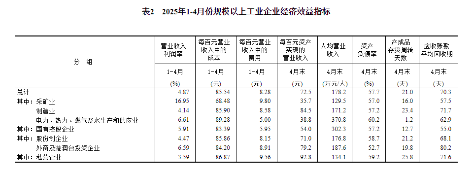 4月末,规模以上工业企业每百元资产实现的营业收入为72.5元,同比减少1.3元;人均营业收入为178.2万元,同比增加5.9万元;产成品存货周转天数为21.0天,同比增加0.2天;应收账款平均回收期为70.3天,同比增加4.0天。
