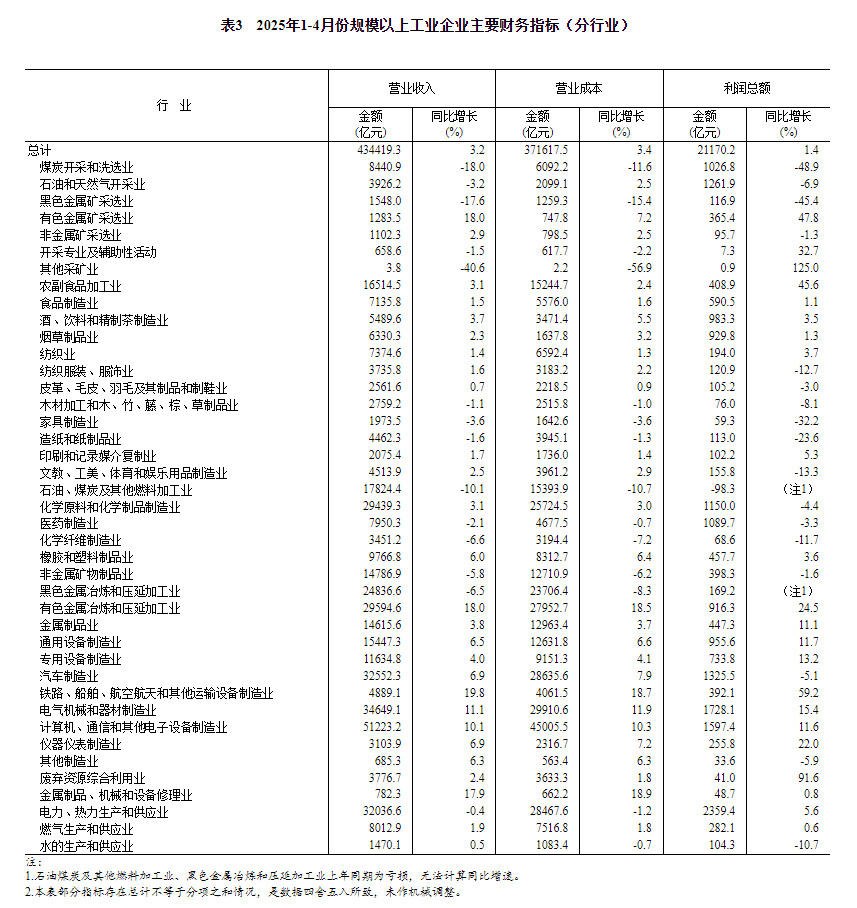 1—4月份,全国规模以上工业企业实现利润总额21170.2亿元,同比增长1.4%(按可比口径计算,详见附注二)。