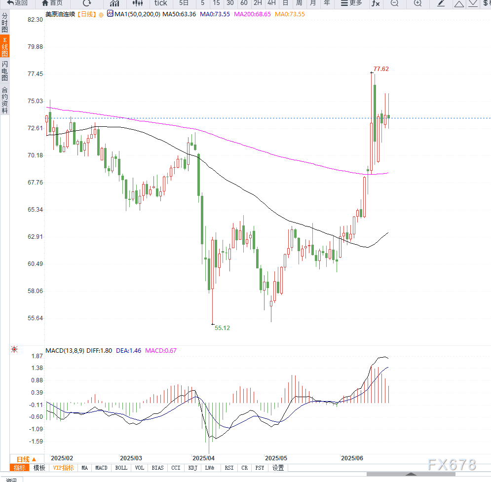 本周油价走势延续上涨态势,尽管周五出现短暂回调。截至周五亚洲时段,布伦特原油期货下跌1.57美元,跌幅达2%,报每桶77.28美元。但本周累计涨幅达到3.9%,实现周线三连涨。 地缘政治风险继续推高市场情绪。周四油价一度飙升近3%,因以色列轰炸伊朗核目标,而伊朗则在此前对以色列医院实施导弹袭击后,向以方发射无人机和导弹。 “油价高位运行,主要是由于油轮费用翻倍,以及部分船只避开霍尔木兹海峡,”The Price Futures Group分析师Phil Flynn表示。 “虽然伊朗原油出口暂未遭到实质性破坏,但市场对供应链中断的担忧情绪未减,”Flynn补充道。 伊朗原油产量在OPEC国家中排名第三,日产量约为330万桶。霍尔木兹海峡是全球最关键的石油运输通道之一,每日有1800万至2100万桶原油及成品油经过该区域。当前的战争态势,可能导致该海域运输中断,引发供应链危机。 以色列总理内塔尼亚胡誓言让伊朗“付出全部代价”,而伊朗则警告称,如果“第三方”介入,将扩大冲突规模。 据市场调查显示,白宫方面回应称,总统特朗普将在未来两周内决定美国是否介入以伊冲突。 “‘两周决定’是特朗普在重大外交决策中常用的策略之一,通常并不意味着立即行动。如果维持当前态势,油价可能将维持高位,甚至进一步上涨,”IG分析师Tony Sycamore指出。 从技术面看,美国原油(WTI)日线图显示价格维持在短期均线上方,MACD指标保持在零轴之上,显示多头仍具主动性。若价格能守稳在73美元上方,下一目标或将测试76.80至78美元区域的前期高点阻力位;若跌破73美元,短线或进入震荡回调格局。