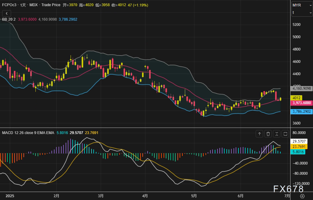 周四(6月26日)马来西亚衍生品交易所9月交割的基准棕榈油合约(FCPOc3)收报4012林吉特/吨,单日涨幅1.19%,但周线终结六连阳录得2.57%回调。值得注意的是,日线布林通道(20,2)中轨3973林吉特构成日内支撑,而MACD柱状体收窄至5.8,显示短期动能有所衰减。适逢马来西亚公共假期休市前,市场正在重新评估供需格局的边际变化。