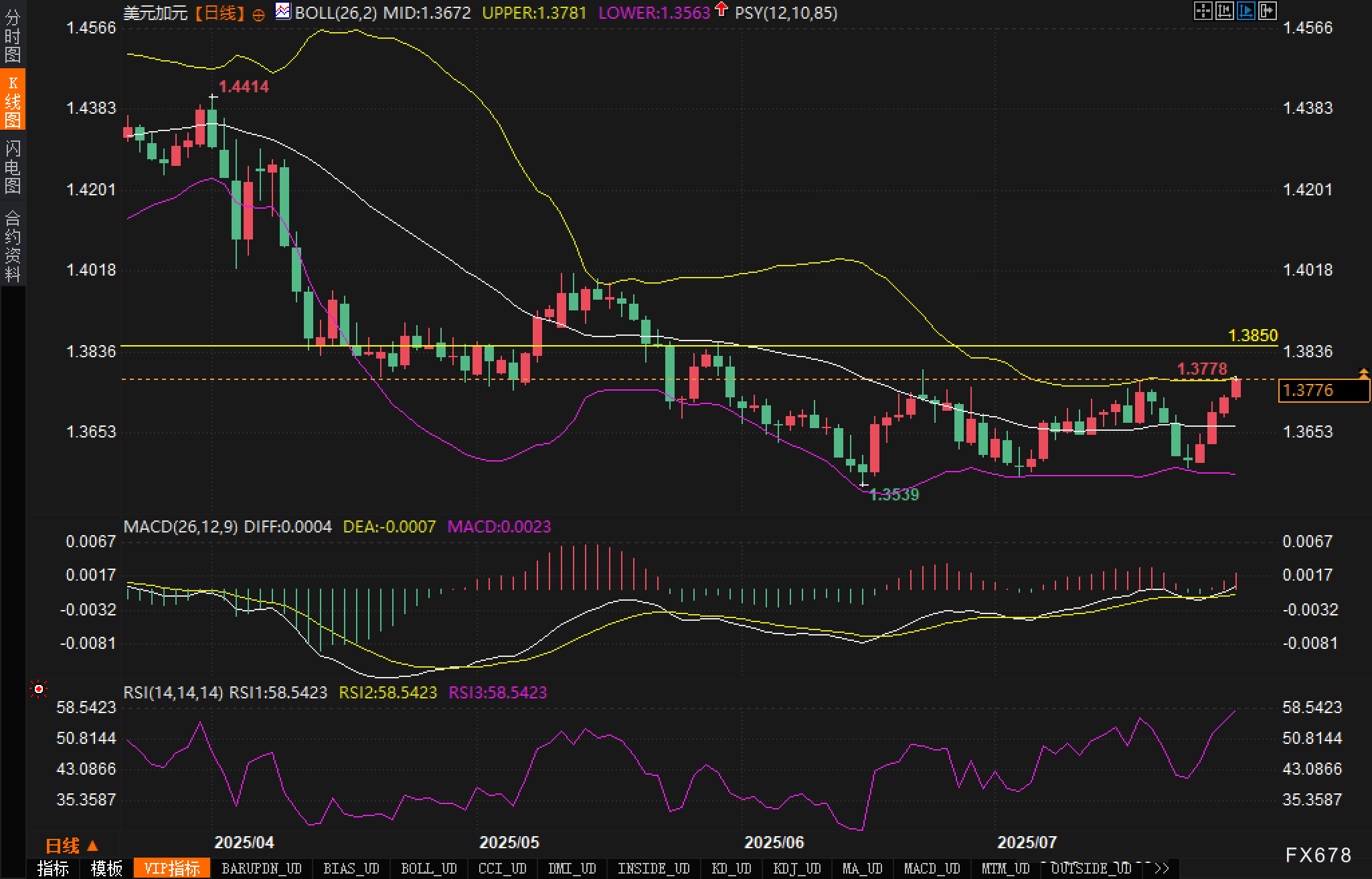 本周美元的强势主要源于贸易领域的积极进展。美国与欧盟的新关税安排缓解了市场对全球贸易摩擦可能进一步升级的担忧,支撑了美元的避险与基本面需求。交易员认为,近期的关税安排在谈判力度与市场承受度之间取得了平衡,助推美元延续升势。 美元指数触及99.00关口,为近一个月高点,显示美元买盘需求强劲。另一方面,加拿大经济近期数据表现温和,尤其在能源价格波动和出口增长放缓的背景下,加元动能不足。虽然加拿大央行预计将维持利率不变,但在美国货币政策持续强硬的衬托下,加元显得相对脆弱。 值得关注的是,今日晚间将公布的美国6月JOLTS职位空缺数据预计为755万,低于5月的777万。若数据优于预期,将进一步巩固美元的强势格局;若逊于预期,或为汇价带来短线回调压力。整体来看,市场在央行决议前保持谨慎,短线资金流向仍偏向美元。 技术面: 从日线图来看,美元兑加元在近期持续反弹,再度逼近关键阻力位。布林带显示,中轨位于1.3672,当前汇价运行在布林上轨附近,技术面动能偏多。布林带上轨1.3781已构成首要阻力位,若突破,则进一步上行目标将指向1.3850关口。