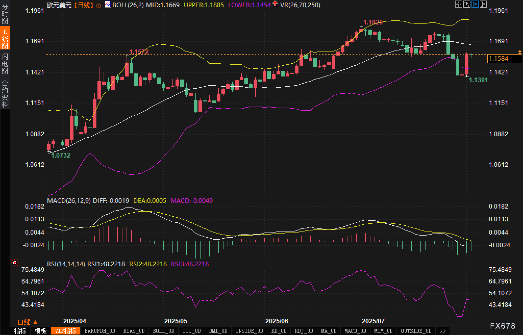 基本面: 上周五美国劳工部公布的7月非农就业人口仅增加7.3万人,远低于市场预期的11万人,且前两个月数据被大幅下修:5月从14.4万下修至1.9万,6月从14.7万下修至1.4万。这一系列数据引发市场对美国经济前景的深度担忧,并激发对美联储9月降息的强烈押注,CME Fed Watch工具数据显示,9月降息概率由40%激增至80%。 更具爆炸性的事件在于:总统特朗普在数据公布后公开指责劳工统计局篡改数据,并随即解雇了BLS局长Erika McEntarfer,称其“让共和党和我颜面尽失”。此外,美联储理事Kugler宣布辞职,令市场更加担心政策独立性和未来决策倾向。这一连串政治与经济动荡,令美元多头短期溃散,欧元借势拉升。 然而,欧元区自身基本面亦难言乐观。Sentix投资者信心指数意外跌至三个月低点-3.7,远不及预期的8.0,也低于前值4.5,显示区域经济信心再度恶化。贸易前景和内需不振仍是欧元的中长期风险点。 技术面: 从欧元/美元日线图来看,汇价在上周五强劲反弹后,目前运行于布林带中轨(1.1669)下方,技术反弹初现端倪,但趋势尚未反转。MACD指标中,柱状图仍处于绿柱阶段,显示空头动能依旧主导。相对强弱指数(RSI)自低位反弹至48.22,虽脱离超卖区,但尚未回归强势区域,反映出反弹过程中仍有阻力。