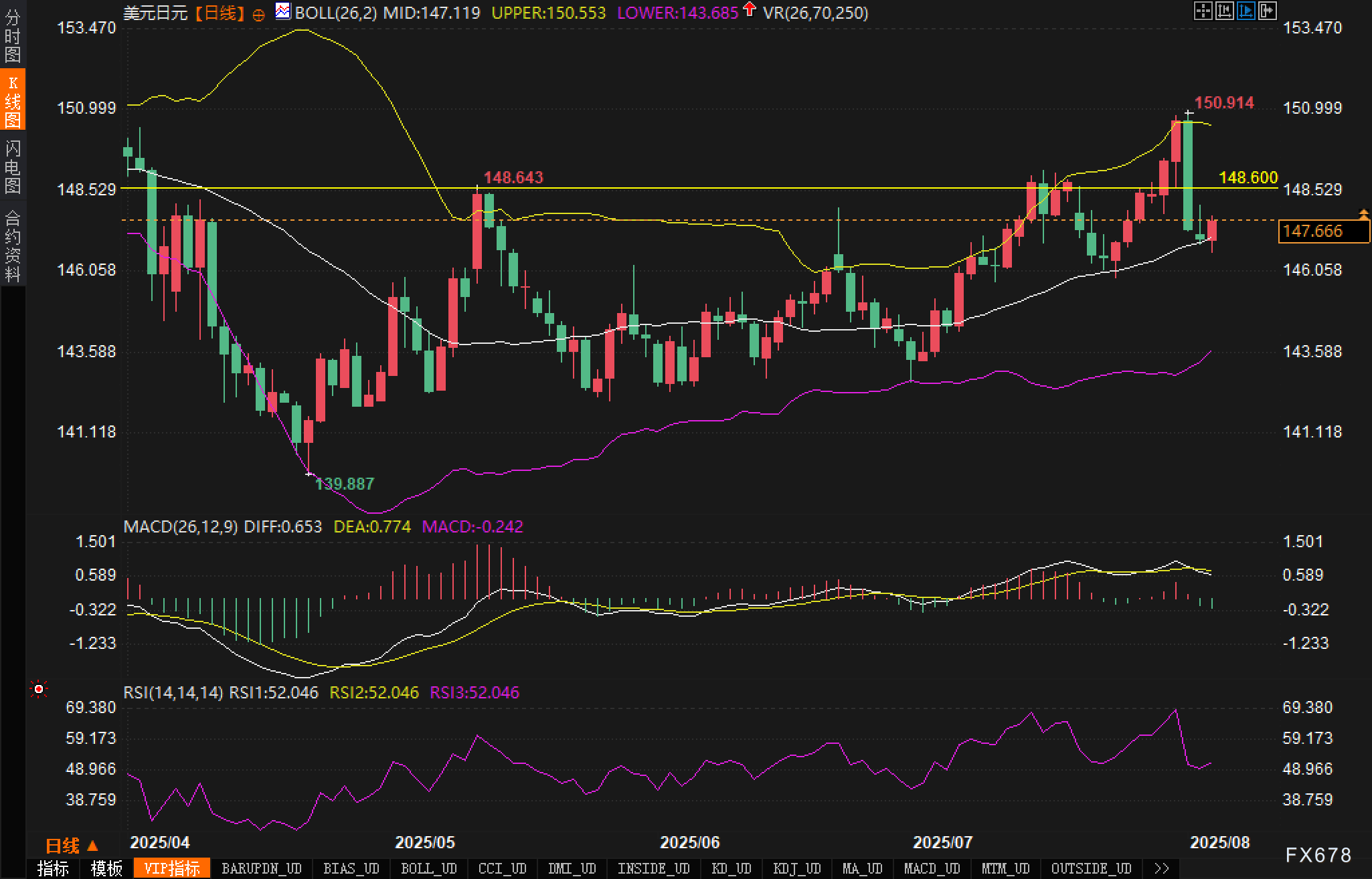 与此同时,美国方面的影响同样不容忽视。尽管美元指数(DXY)日内略有回升至99.00附近,但整体走势仍受制于疲软的7月非农就业报告影响,数据显示劳动力市场降温明显,市场对美联储9月降息的预期快速升温,CMEFedWatch工具显示降息概率高达92.2%。分析认为美元短线企稳反弹更多源于技术修正和对日元走弱的对冲行为,而非基本面持续改善。 技术面: 从美元兑日元日线图来看,汇价近日自150.91高点回落,现位于布林带中轨与上轨之间。布林带轨道呈现明显扩张状态,表明波动率正在上升。当前价格已跌破前期关键支撑148.60,并临近中轨147.12,分析认为该水平若失守,将可能引发进一步下探至布林下轨143.68附近。