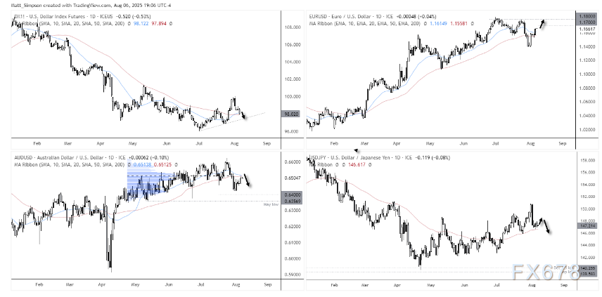 英镑兑美元与英镑兑日元承压于英国央行鸽派降息预期,美元走弱提供短期支撑 英镑在英国央行(BOE)会议前出现反弹,主要受美元走软推动;但市场普遍预期英国央行将降息25个基点至4.0%,无论是投票分布还是前瞻指引,若会议释放鸽派信号,英镑兑美元与英镑兑日元的下行风险或进一步加剧。 与此同时,美元走低源于非农就业数据不及预期与ISM服务业数据疲软,叠加美国明尼阿波利斯联储主席尼尔·卡什卡里在CNBC的表态引发美联储降息猜测。尽管服务业通胀仍显顽固,但交易者正密切关注后续信号——当前两种英镑货币对均处于关键技术位附近,变盘或一触即发。 美元走弱态势延续,英国央行降息成英镑关键压制 周三(8月6日)美元普跌,美联储内部降息压力持续升温。卡什卡里关于降息的暗示因此前疲软的就业与服务业数据更具分量;尽管ISM数据服务价格上涨,但美联储成员对关税引发的通胀是否为暂时性存疑。随着经济数据走弱,支持降息与美元走弱的逻辑正不断强化。 从技术面看 美元指数、欧元兑美元、澳元兑美元及美元兑日元均显示美元存在偏空的动能:美元指数在98关口上方显弱,2日RSI小于10进入超卖区间;欧元兑美元逼近1.17关键位,突破或需美元指数跌破50日均线,在97.89附近,目前为潜在支撑; 澳元兑美元回升至0.65上方,但50日与20日均线叠加密集成交区的0.6513构成阻力; 美元兑日元在周二看涨的吞没K线组合的低点146.62上方暂稳,或存短暂反弹,但最终跌破146的概率更高。整体而言,英国央行会议前及美联储降息预期上升背景下,美元仍有进一步走弱空间。