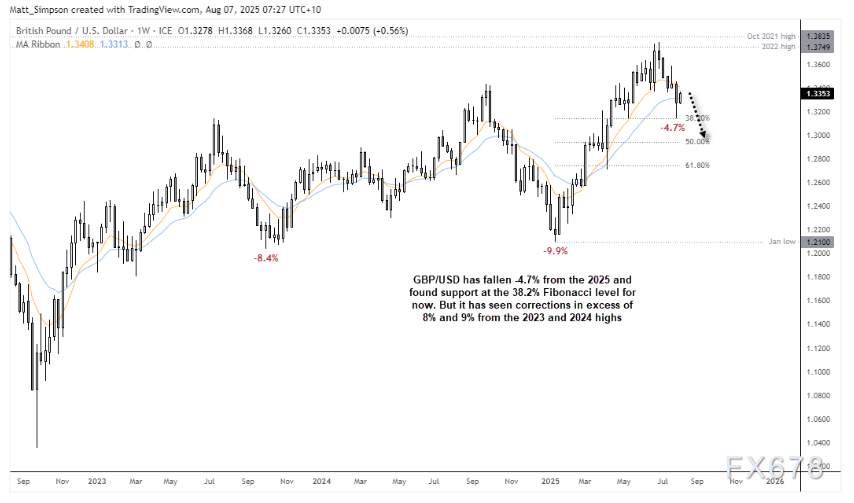 英镑兑美元技术分析:短期或形成反弹高点,下行空间明确 英镑兑美元周线视角:英镑兑美元自7月高点下跌4.7%,其中半数跌幅发生在上周的看跌吞没K线形态期间。考虑到多数下跌倾向会以一共三浪的形式展开,当前跌幅(4.7%)相对较浅(2023年高点以来跌幅8.4%,2024年高点以来9.9%),未来数周或数月可能进一步下行。关键支撑位包括成交密集区的1.2938,以及4月低点与61.8%斐波那契回撤位(略高于1.2700)。