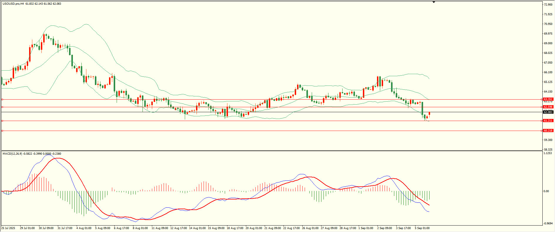 原油上周五延续走低,至收盘触及第二支撑略有缓和,日线报收中阴线,收盘位置触及前支撑,下破后方可打开下行空间,从4H来看,布林中轨偏下,MACD零轴下方运行,日内上方首要阻力62.60,第二阻力63.35,下方支撑61.20,60.20保持在第一阻力下方短线有望测试第一阻力。