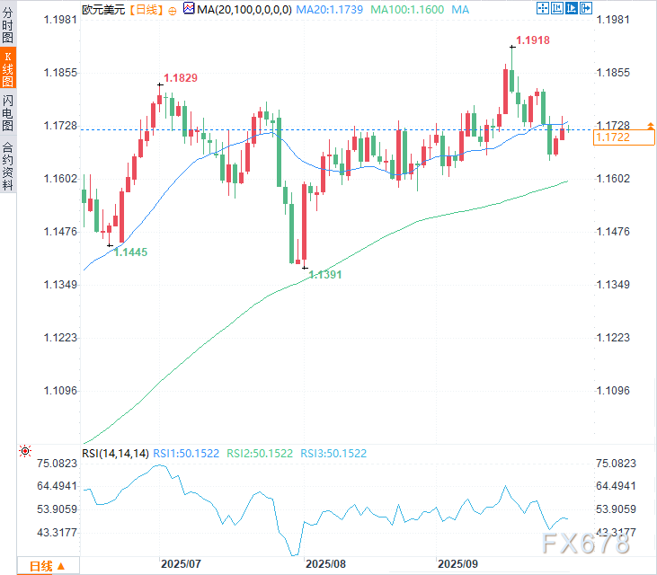 美元欧元同时承压 随着美国总统特朗普与参众两院民主党领袖会晤,美元对十国集团多数货币走弱。参议院民主党领袖舒默会后表示“双方存在重大分歧”,众议院民主党领袖杰弗里斯明确反对“损害医疗保健的党派性共和党法案”。与此同时,彭博社头条报道副总统万斯称“与民主党会谈后美国正走向政府停摆”。 早间美国住房数据表现乐观,但美联储官员言论出现分歧。圣路易斯联储主席穆塞勒姆持鹰派立场,认为通胀预期“偏高”并承认劳动力市场走软;克利夫兰联储主席哈马克指出通胀过高且趋势堪忧;纽约联储主席威廉姆斯则强调现行政策已具限制性,正对通胀构成下行压力,韧性十足的劳动力市场正在逐步软化。 周一数据显示欧元区消费者信心虽有所改善,但仍低于历史平均水平,欧元仍面临难关。本周后续重点数据包括:ADP全国就业报告、ISM制造业PMI、初请失业金人数及9月非农就业数据。 美国房市数据强劲,欧元兑美元动能不足 美国8月未决房屋销售指数强势反弹,环比增长4%,较7月上修后的-0.3%显著改善,远超市场预期的0.3%增幅。 上周核心PCE数据符合预期,进一步强化美联储延续宽松政策的预期。根据Prime Market Terminal利率概率工具显示,联邦基金利率期货目前押注10月降息25个基点的概率达89%,而降息50个基点的概率仅为11%。 欧元区方面,9月消费者信心指数从-15.5微升至-14.9;工业信心指数自-10.2小幅下滑至-10.3,但仍优于-10.9的预期值;服务业信心指数则从3.8回落至3.6,低于3.7的共识预期。 技术分析:欧元兑美元窄幅震荡 周二亚市时段欧元兑美元暂显动力不足,未能保持先前连续两日收涨的态势,当前在20日简单移动均线(1.1739)下方呈现震荡整理态势。 相对强弱指数(RSI)在中性区域走平,预示汇率或将在当前水平持续震荡。 上行方面,若突破20日均线(1.1739)阻力,后续阻力位依次看向1.1800整数关口及年内高点1.1918。 下行方面,若跌破1.1700支撑,可能下探1.1650,继而测试100日移动均线1.1600支撑位。
